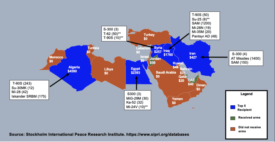 The value (expressed in millions of SIPRI TIVs) of Russian arms exports to MENA states (See Figure 2). Depicted in the figure are the major weapons systems distributed to Moscow's top 5 recipients (outlined in blue). Russia’s top 5 partners (by dollar value of equipment transferred) are Algeria, Egypt, Iraq, Iran, and Syria. Numbers in parentheses indicate the number of systems transferred to the partner; ** indicates that the equipment transferred was second-hand.