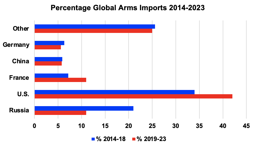 The percentage of global arms exports by supplier from 2014-2023. One thing to note is that the data is bifurcated into two five-year periods to depict changes in market share over time. The United States remains the world’s largest exporter of arms, supplying ~42% between 2019-2023. Russia experienced a 9 percent decline in its global market share from 2014-2018 to 2019-2023 and was replaced by France as the world’s second largest global arms supplier.