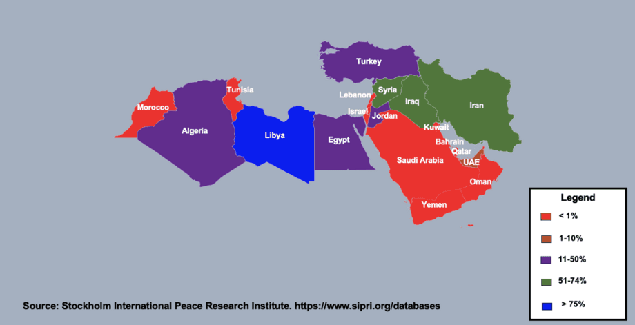 The percentage of arms imported from Russia by each MENA state from 2014-2018. This figure clearly depicts Moscow’s focus on a select few partners, with both Syria and Iran receiving greater than 75 percent of their arms from Russia. Additionally, the increase in post-Arab Spring Egyptian arms imports is quite apparent.