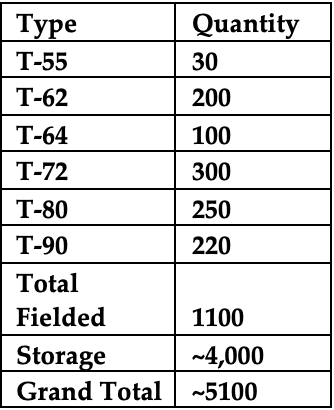 This table captures the number of tanks Moscow is estimated to possess, with 1,100 fielded to the Russian Armed Forces and approximately 4,100 tanks in storage. Of note, the tanks in storage include a range variants of the following MBTs: T-55, T-62, T-72, T-80, and T-90.