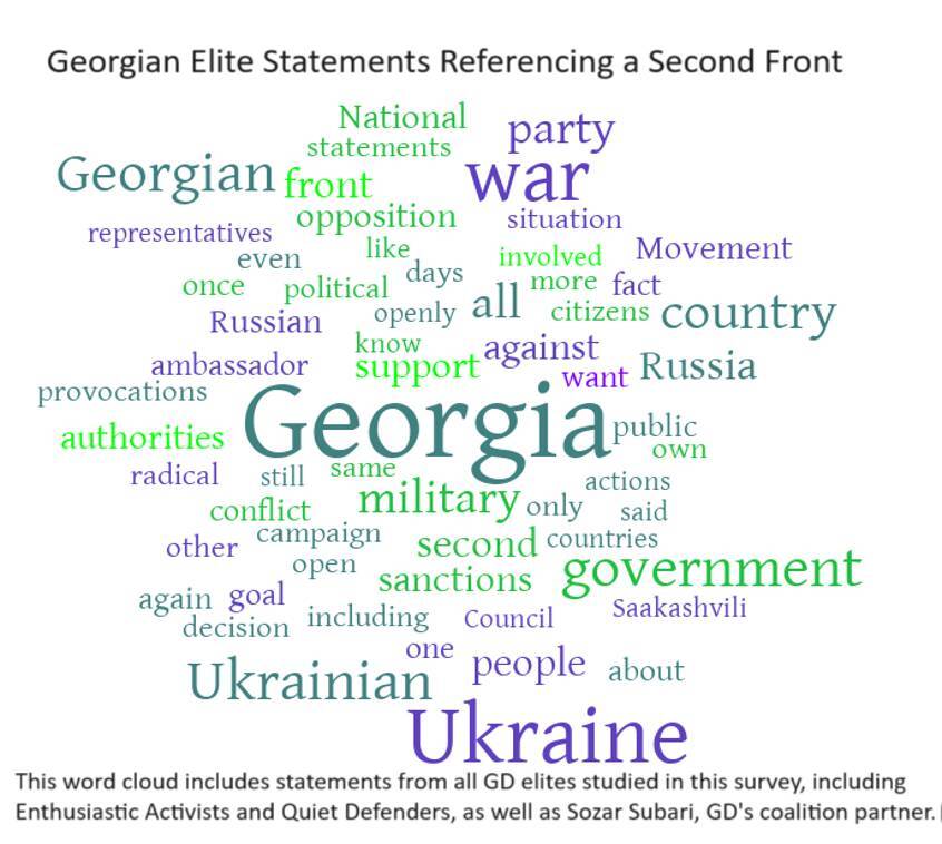 Sozar Subari, the head of People’s Power, a party in coalition with GD made up of former GD members, was also looked at for this study. All three of Subari’s statements reviewed include explicit arguments that a second front is being forced on Georgia by the US, Ukraine and the EU.