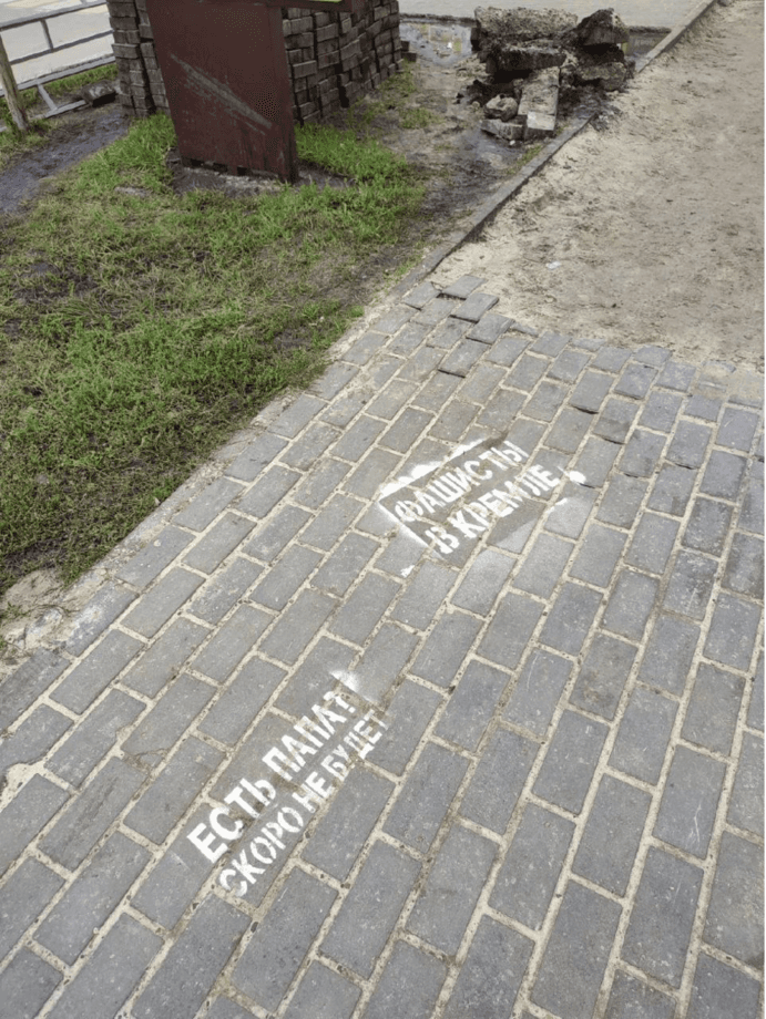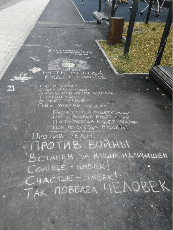 6. Although the protest landscape is clearly dominated by virtual spaces, it would be more correct to speak of the hybrid nature of the anti-war resistance. Digital space prolongs physical life and expands the audience of in-person protests. Photos of art pieces and folk memorials, as well as other forms of protest are instantly circulated through Telegram channels. Conversely, initiatives that arise in Telegram chats are later implemented in physical space.