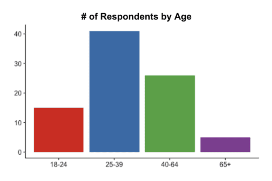 Almost half of our respondents were between the ages of 25 and 39. There were slightly fewer people under 25 and between 40 and 65. Only a few interview subjects were over 65 years old.