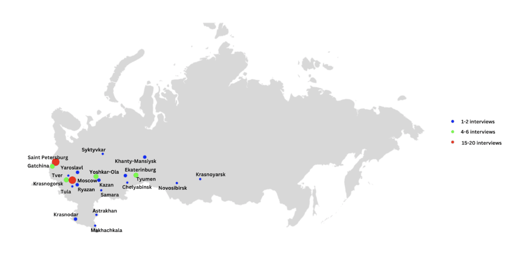 The map below illustrates the geographic locations of our respondents. In order to protect their anonymity, we did not indicate the smaller cities in which we conducted interviews—instead, we marked the corresponding capitals of the federal subjects (for instance, Gatchina represents the Leningrad Oblast and Krasnogorsk represents the Moscow Oblast). Our sample is skewed in favor of these two capitals and in favor of the western part of Russia as a whole.