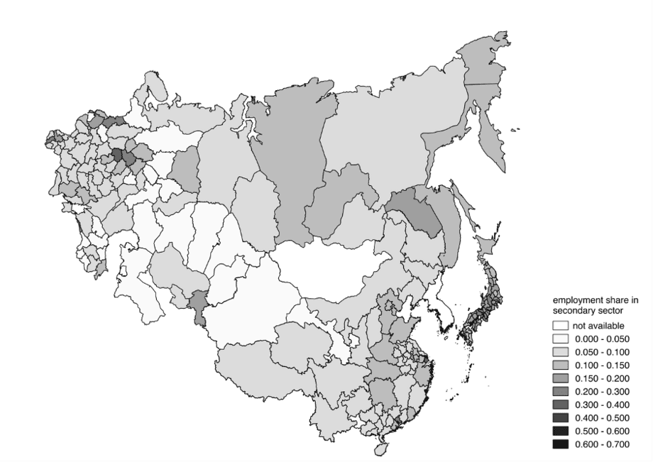 An impression of the uses of the data in its modern classification is presented in the following set of maps, which plot the data on occupational structure for the last three cross sections of the Repository by region. These maps show the share of the workforce by region employed in the secondary sector of the economy (manufacturing & mining) as defined by the PSTI classification of occupations. Note that the 1897 data covers the entire Empire, with the core territory covered by the other cross sections indicated with a black line. Source: Kessler, Gijs and Timur Valetov, “Occupational change and industrialization in Russia and the Soviet Union, 1897-2002,” in Osamu Saito and Leigh Shaw-Taylor (eds), Occupational structure, industrialization and economic growth in a comparative perspective (forthcoming) These maps show not only the expansion of industrial employment throughout the 20th century, but also its spread from a small number of industrial hotspots in European Russia toward the East and North of the country, as well as its subsequent retreat to certain core areas.