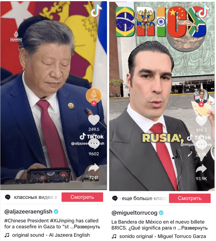 In addition to news outlets, individual influencers also played a key role in shaping the narrative around the BRICS summit. Among them, Miguel Torruco Garza, a Mexican politician and businessman, stands out. A member of the political party Morena, which is led by ex-President Andrés Manuel López Obrador, Garza actively engages with his 1.7 million followers on TikTok. One of his videos on BRICS became the most liked in this category, amassing 964,000 likes and 11.5 million views (link to video). Such engagement helped raise awareness of BRICS in Mexico and showcased how influential figures can mobilize audiences across borders. Another of Garza's posts received 400,000 likes (link to second video).