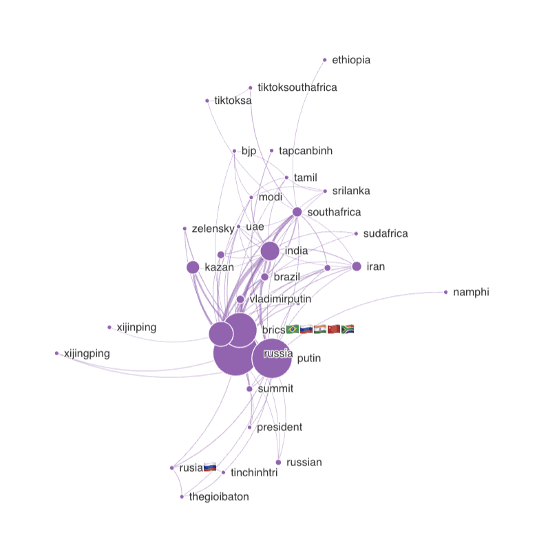 One of the largest and most influential clusters in the BRICS-related hashtag network on TikTok revolves around Russia. Approximately 25% of BRICS-related videos mention Russia, largely due to the summit’s location in Kazan. Noteworthy is the prominence of the hashtag #Russia in English, which was the central node. This English-language hashtag connects to other key hashtags, including #VladimirPutin, #economy, #China, and #India, framing Russia as an integral global player within the multipolar BRICS alliance rather than just a regional power. We also see variations such as #Россия in Russia and #Rusia in Spanish, inclusive to diverse audiences and enhancing the visibility of BRICS content. This multilingual tagging strategy allows the topic to resonate with audiences outside of Russia, particularly in Spanish-speaking states like Mexico and Venezuela, where the BRICS alliance’s perceived stance on multipolarity and resistance to Western economic dominance strike a chord.