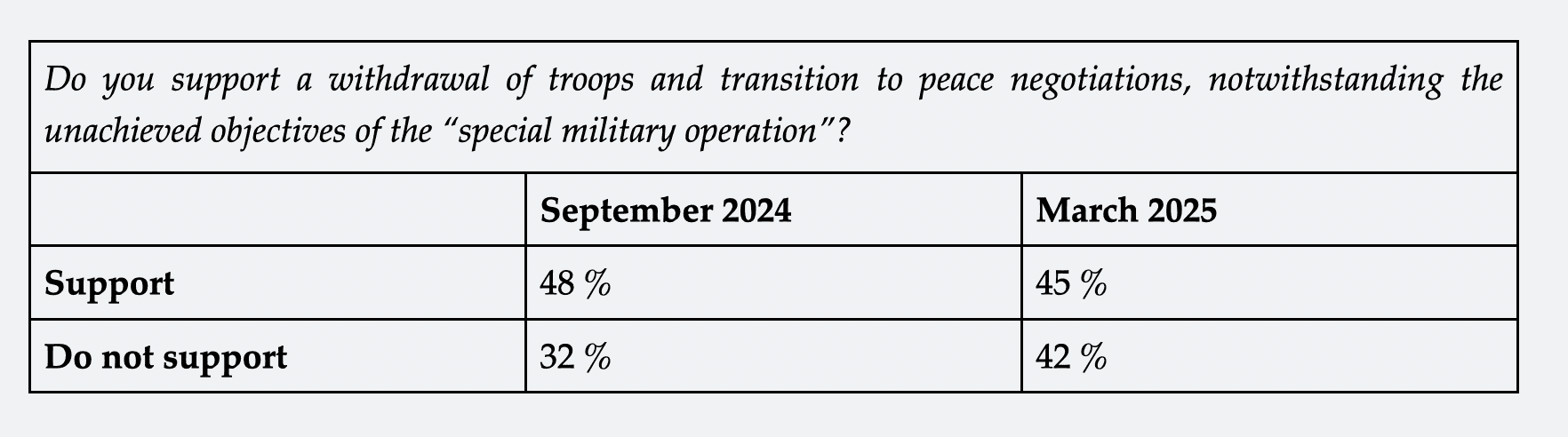 Throughout 2024 and into early 2025, there was a certain equilibrium in Russia between supporters and opponents of ceasing hostilities. According to the research, until February 2025 about half of Russians supported withdrawing Russian troops and negotiating a resolution to the conflict, even though the stated objectives of the “special military operation” have not been achieved.
