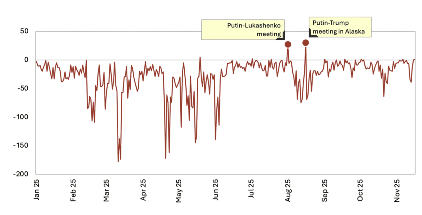 Positive assessments of negotiations exceeded negative ones only twice, and only for a brief time: on August 1, after Putin’s remarks following a meeting with Alexander Lukashenko, where the Russian president said that “[talks] are always relevant and important, especially if their goal is to bring about peace”; and on August 16, after the Alaska summit.