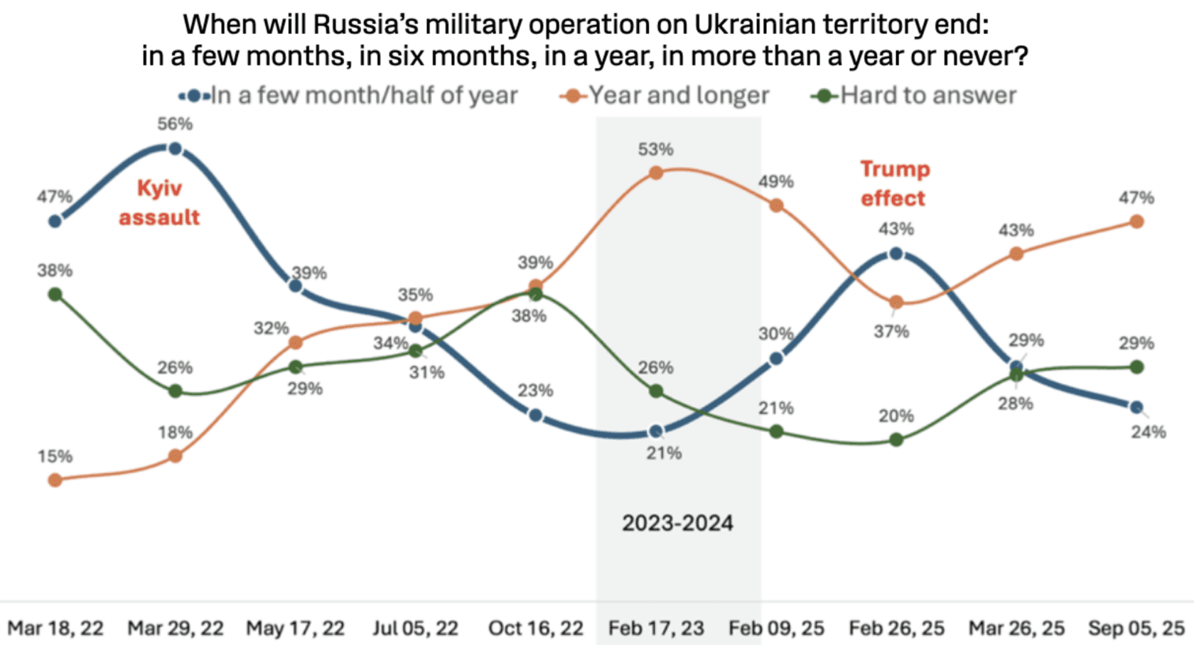 For the first months of the war, at least 35% of Russians believed the war would end soon, yet by summer 2022 those hopes had diminished sharply. Then, for more than two years – from autumn 2022 through early 2025 – only a little over 20% believed the war would end within a few months. At the beginning of February 2025, after Trump’s first speeches as president, the share of optimists reached 30%, and by the end of what was an event-rich February, it had risen to 43%.