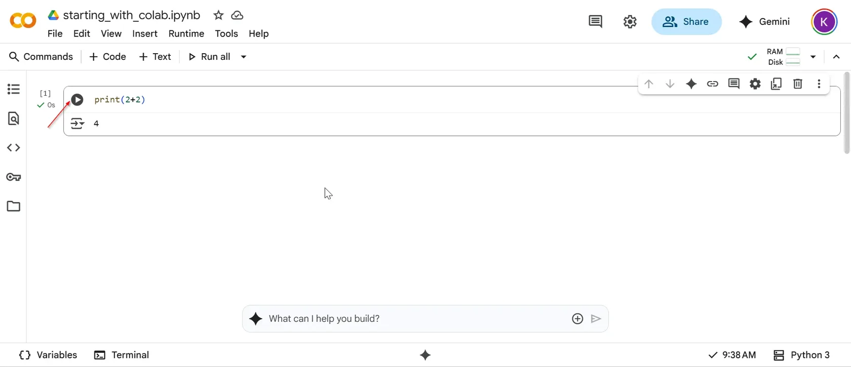 To run the code, you need to click the button with the play icon. After execution, its result will be shown under the cell, and you will see a green checkmark if the code executed successfully.