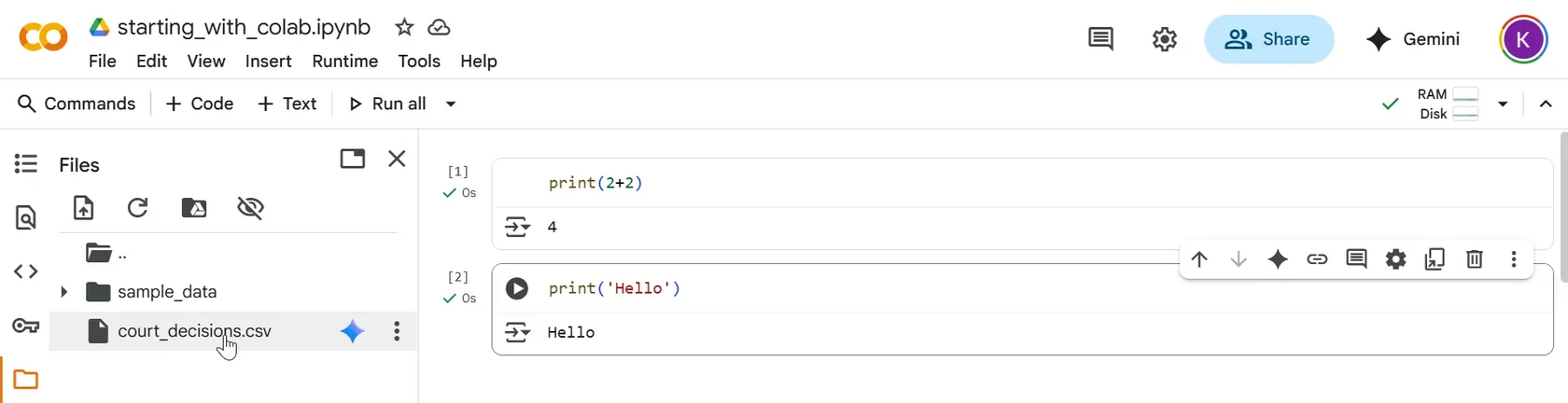 The uploaded file should appear in the file explorer panel on the left side of the screen (we have uploaded court_decisions.csv).