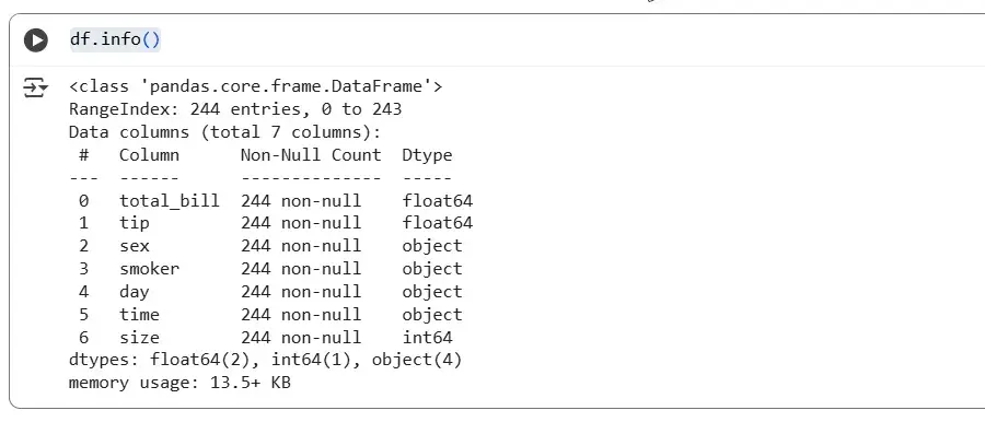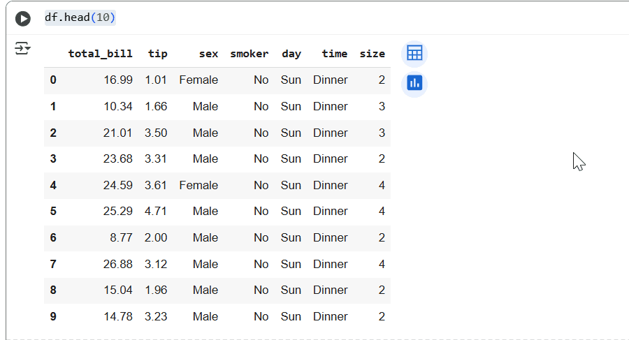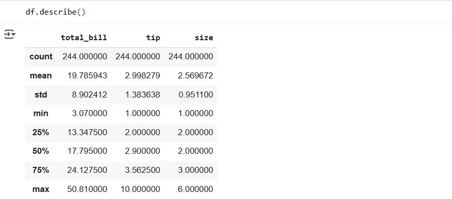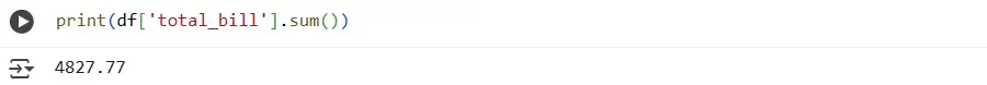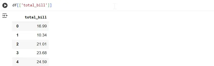 You can use another method: df.total_bill. Here we access the column as an attribute. The result will be the same, but it only works if there are no spaces in the column name. Going forward, we will use the first notation method.