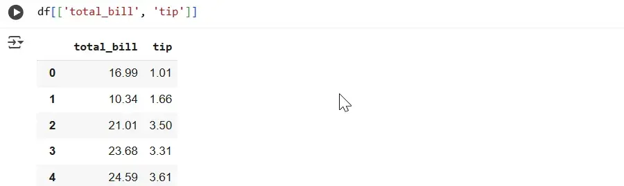 Let's say we can select several columns, for example total_bill and tip. In this case, our code should look like this: