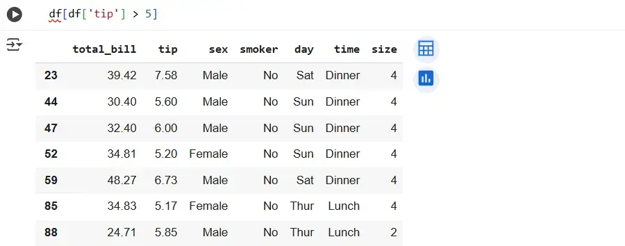 This method also works for numeric variables, but in that case quotes should not be used. The == operator can be replaced with <, >, and other comparison operators if we want to select values that are greater than or less than a certain threshold. Let's choose checks where the tip was more than 5: