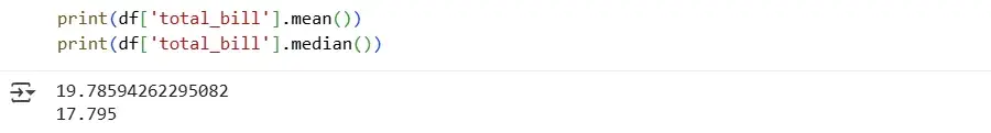 Let's calculate the mean and median values of the total_bill column: