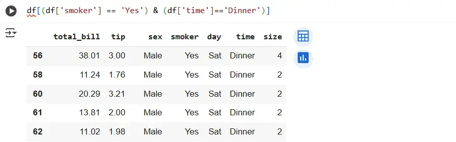 Finally, the last thing we need to learn is to use multiple conditions at once to select part of a DataFrame. Suppose we want to examine the checks of smokers who came for dinner. That is, we need to set two conditions: smoker must equal Yes, and time must equal Dinner. We can combine multiple conditions: