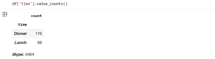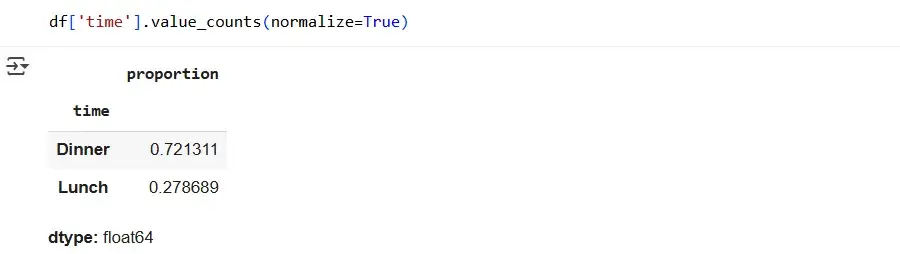 Now we know that 176 checks were issued during the lunch time. The value_counts method can be refined with a parameter so that we not only find out the number of people in each class, but also see the proportions. To do this, let's add an additional argument to our code: